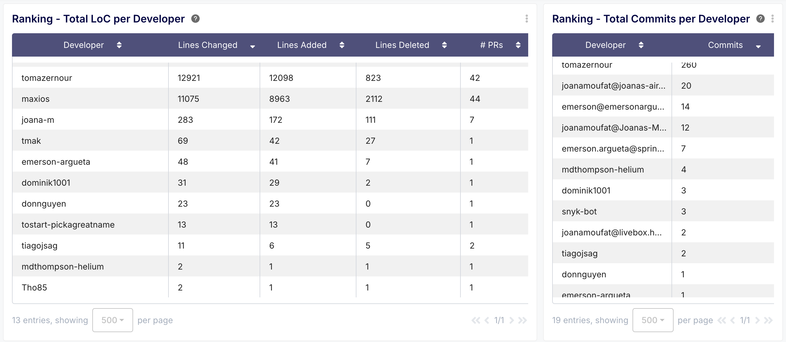 - What you get: Understand typical PR sizes (LoC) with team averages and 95th percentiles (to exclude outliers), plus individual LoC and commit trends.<br>